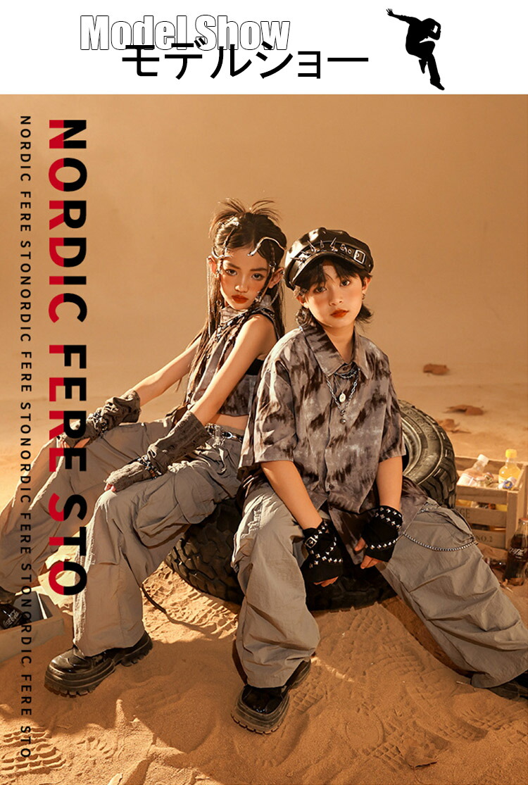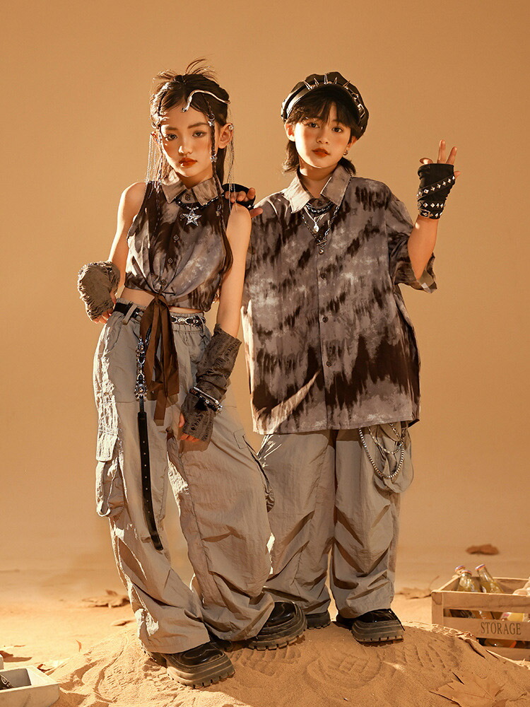 砂漠 未来 武士風 キッズダンス衣装 セットアップ ヒップホップ 男の子 女の子 水墨捺染 シャツ ショート丈シャツ へそ出し 袖なし グレー カーゴパンツ 灰色 コスプレ かっこいい パンク 子供服