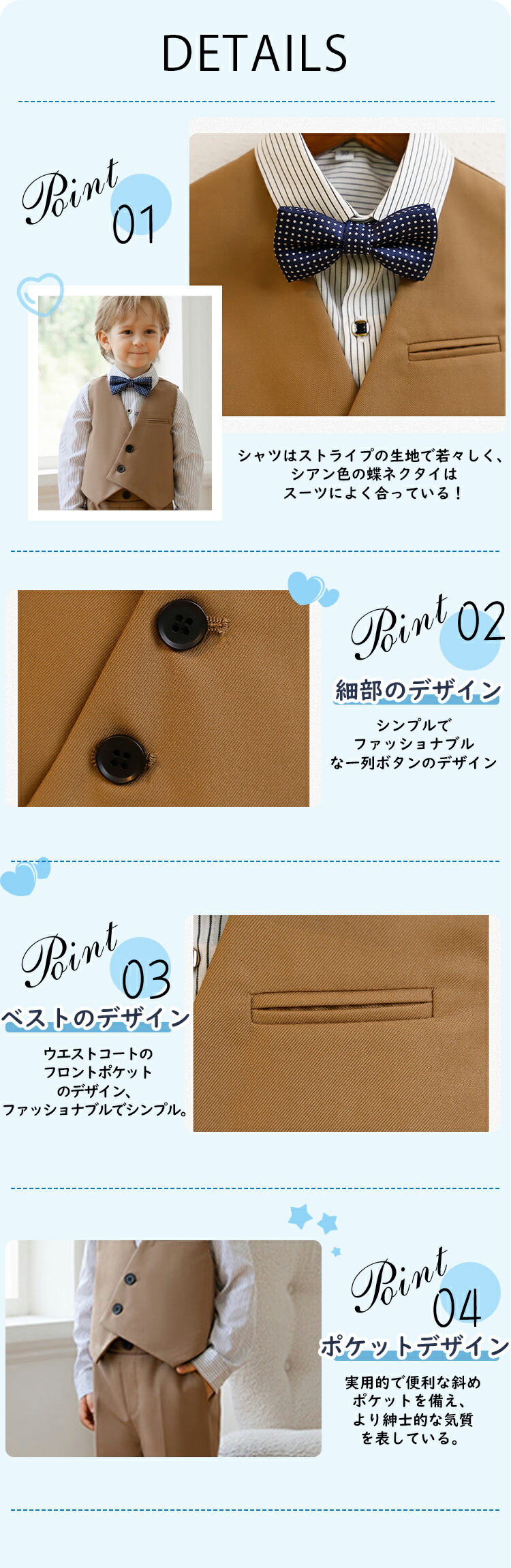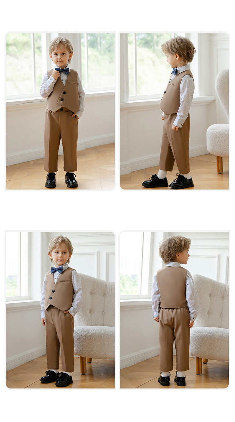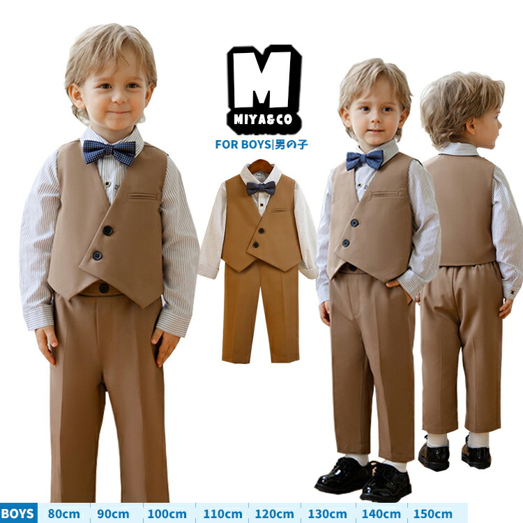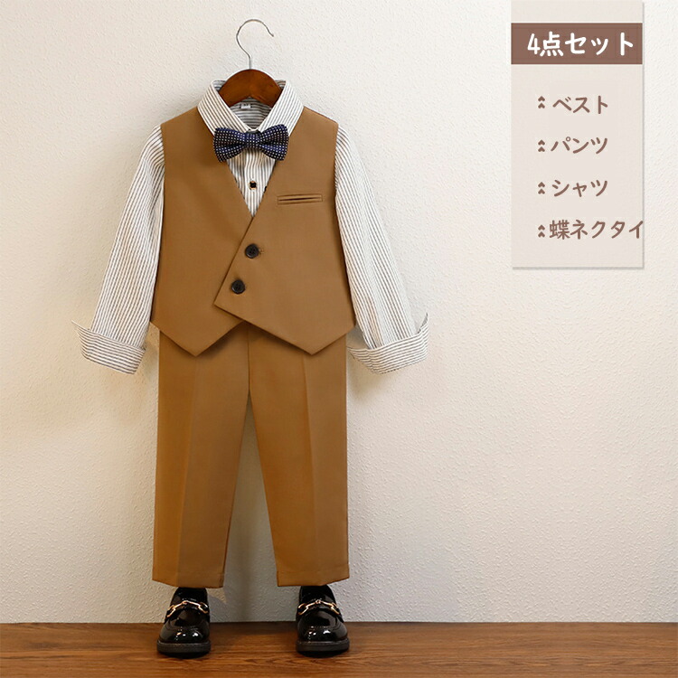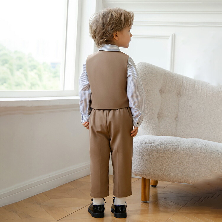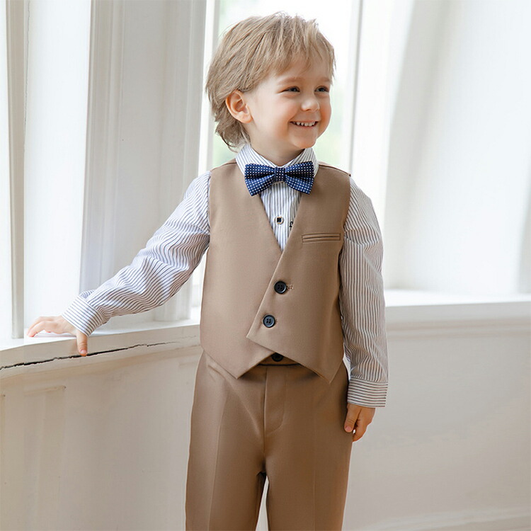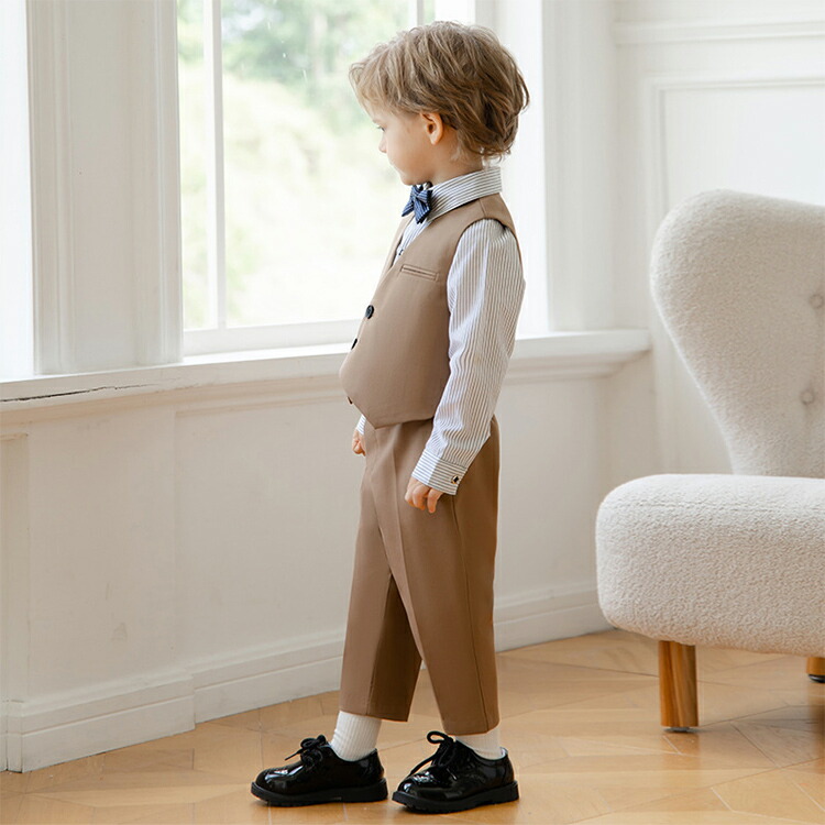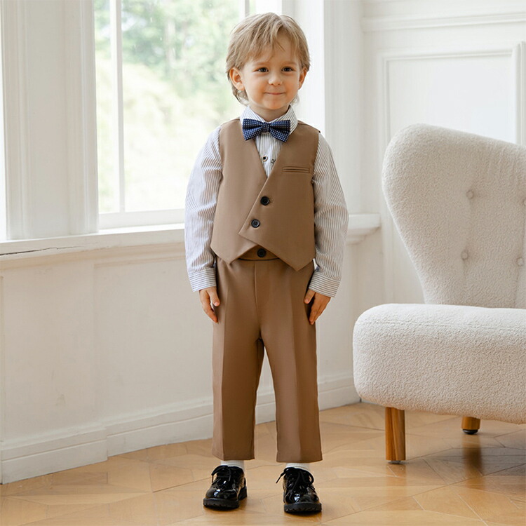 入学式 フォーマルスーツ 英国風 スーツ 男の子 茶色 キッズ ベビースーツ 1歳 ベストセット ストライプ シャツ ブルー 紳士服 3 4点セット 花童 卒業式 結婚式 着 冠婚葬祭