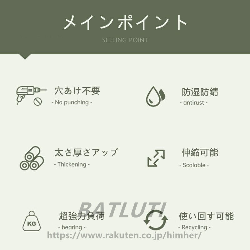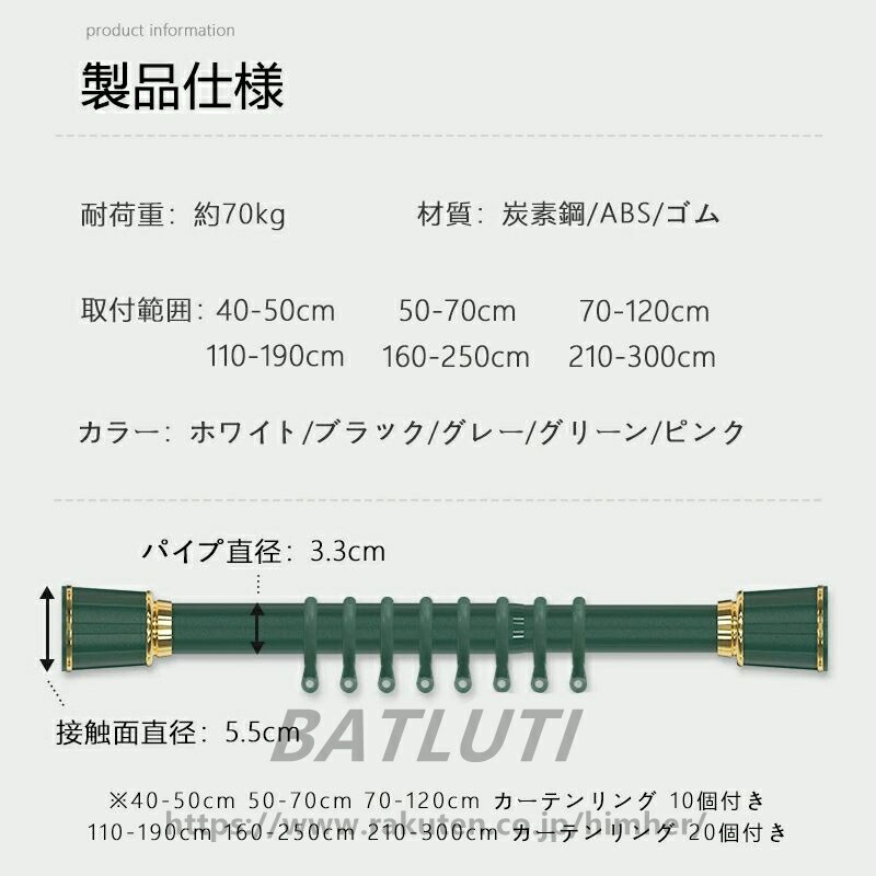 カーテンリング付き突っ張り棒 強力 全 ホワイト ブラック グリーン ピンク グレー 40-50cm 50-70cm 70-120cm 110-190cm 160-250cm 210-300cm