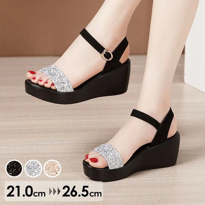 ウェッジソール サンダル キラキラ 厚 靴 続々入荷中 ブラック シルバー ゴールド 21.0 21.5 22.0 22.5 23.0 23.5 24.0 24.5 25.0 25.5 26.0 26.5