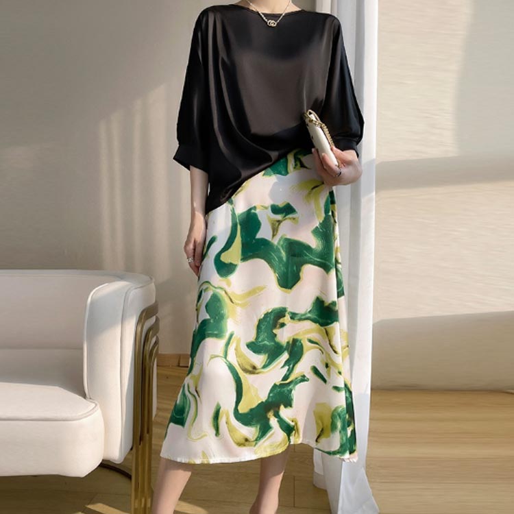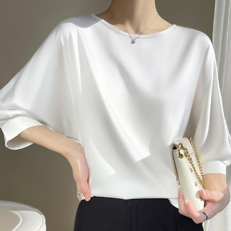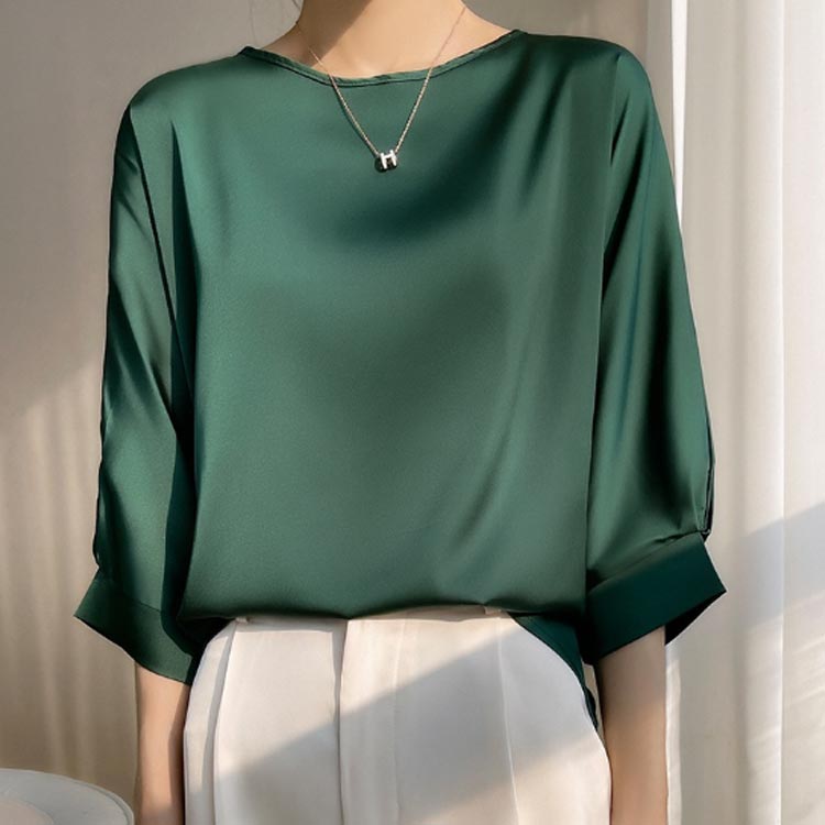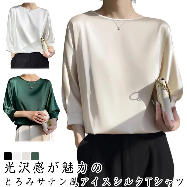 サテン風 Tシャツ レディース 七分袖 トップス Tシャツ カットソー 通販 ホワイト ブラック ダークグリーン シャンパン M L XL 2XL