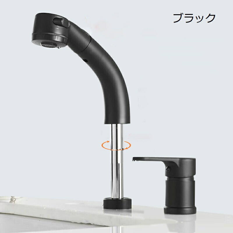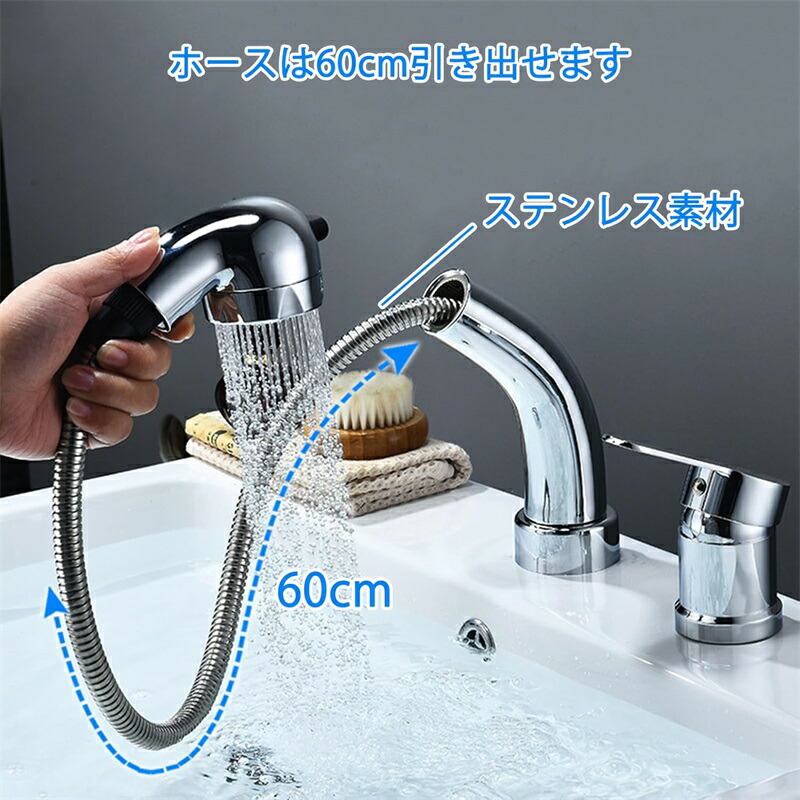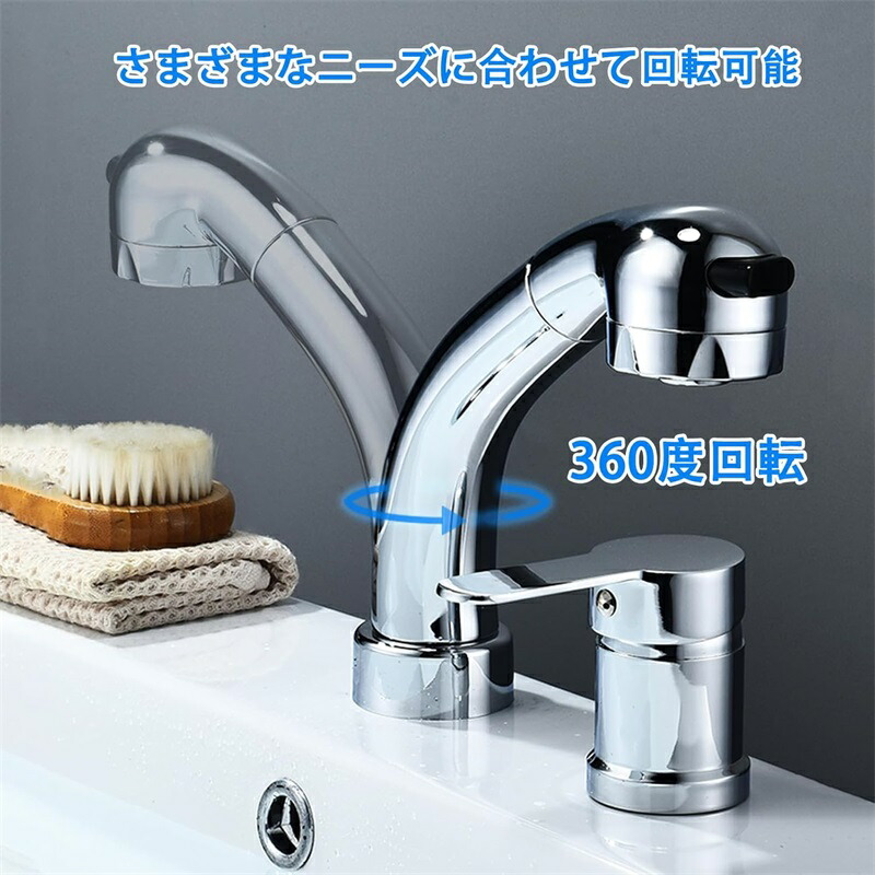 洗面台 蛇口 2穴 浴室用水栓 スプレー 引き出し式 水栓 高さ調節可能 360°回転ノズル 洗面水栓 クローム 冷水ホース付き シャワー 混合栓 温水