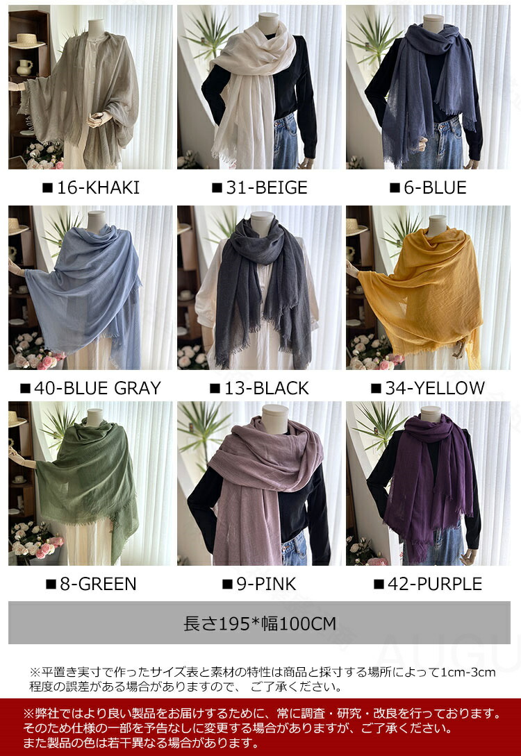 スカーフ 大判 マフラー 夏 コットン バッグ 小物 ブランド雑貨 特集 16-KHAKI 31-BEIGE 6-BLUE 40-BLUE GRAY 13-BLACK 34-YELLOW 8-GREEN 9-PINK 42-PURPLE