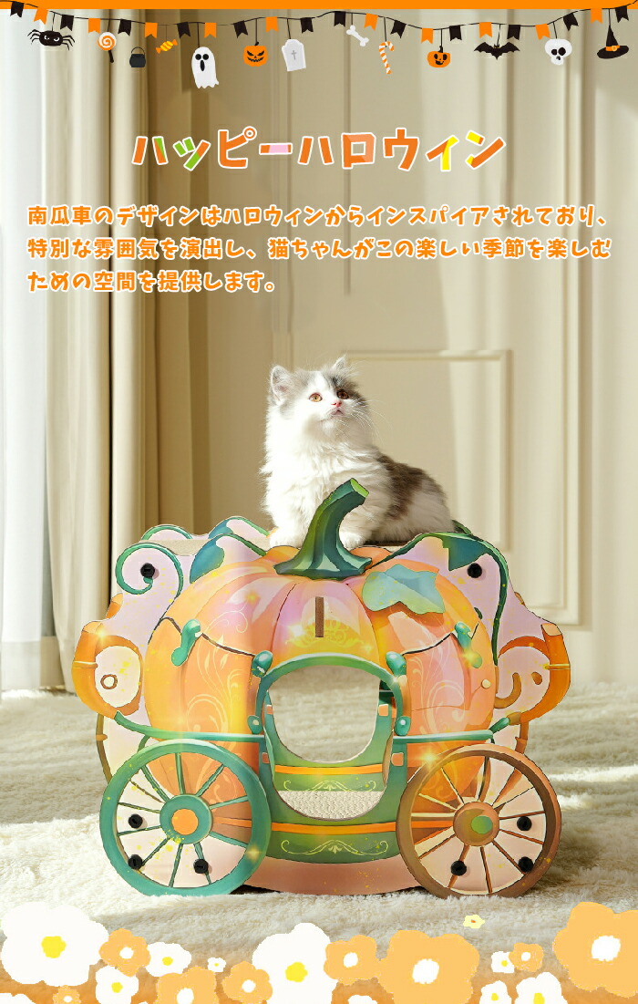 ハロウィンの特徴:南瓜車のデザインはハロウィンからインスパイアされており、特別な雰囲気を演出し、猫ちゃんがこの楽しい季節を楽しむための空間を提供します。