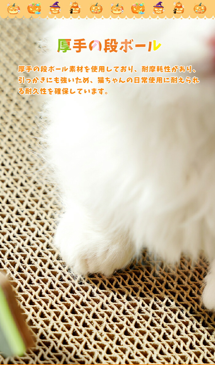 厚手の段ボール:厚手の段ボール素材を使用しており、耐摩耗性があり、引っかきにも強いため、猫ちゃんの日常使用に耐えられる耐久性を確保しています。