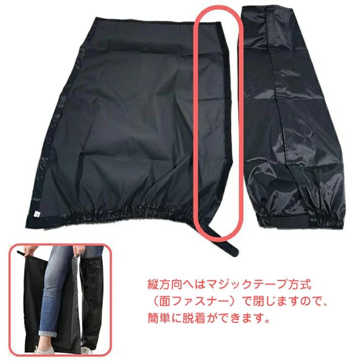 靴を履いたままカンタンに脱着ができる、脚だけのレインコートです。フルオープンタイプのレッグカバーなのでオーバーパンツを履くより簡単に雨からズボンを守ります。