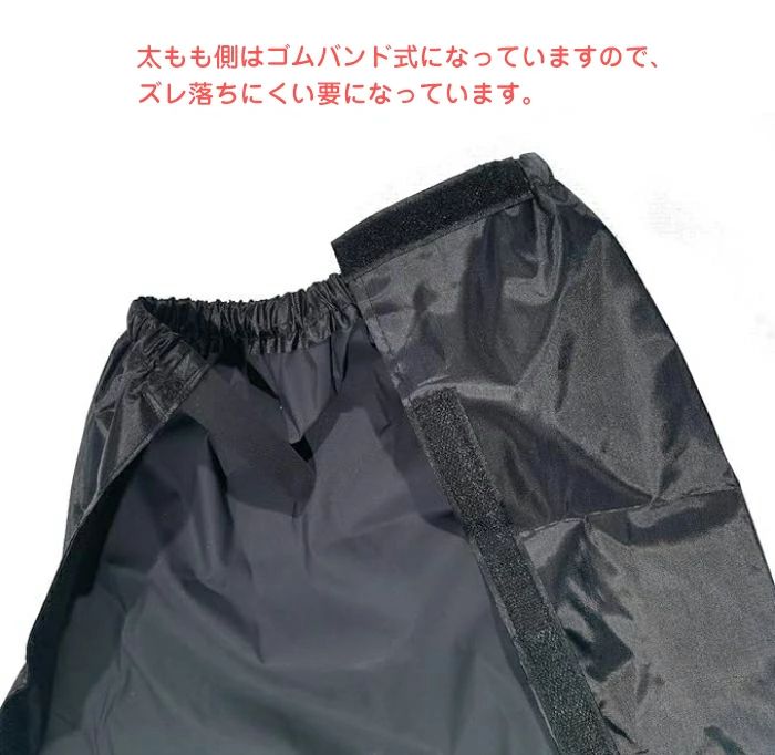 靴の部分はカバーしませんので、長靴との組み合わせがベストな使い方です。雨の日のバイク・スクーター・自転車通勤・通学で役立ちます。