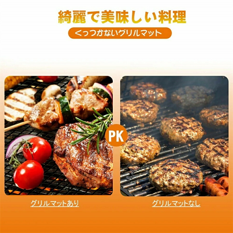 くっつかないグリルマット: このBBQマットは焦げ付き防止できます。粘着力が低くて平滑仕上げな高質シートで油あか、汚れなどを付着しにくい、表面温度の熱を均一なので食品を焦げ付きず、燃え上り、落下などを防げます。密着なネット設計で油が直接炭に落ちませんので煙が抑えられます。