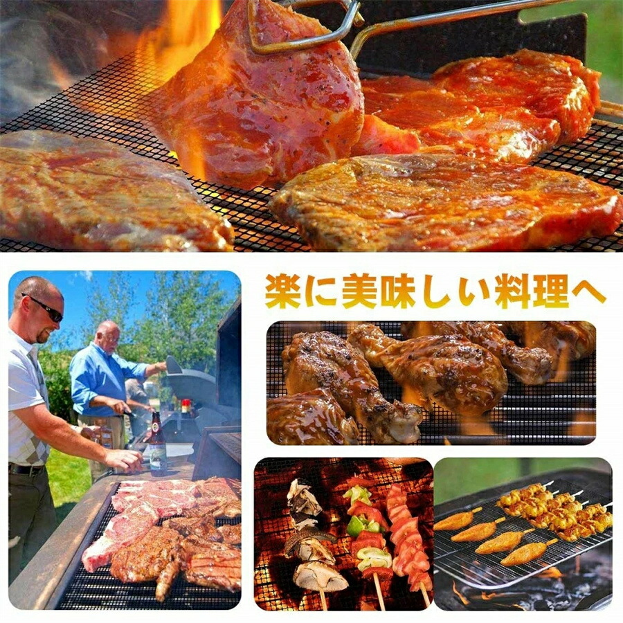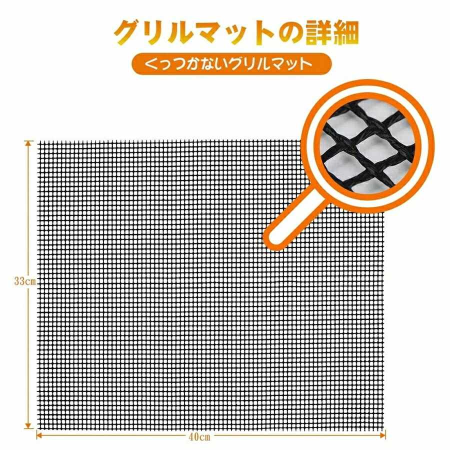 清潔簡単&繰り返す使用のバーベキューメッシュマット:金属などの伝統的な網より清潔しやすいです。グリルマットの表面には油が定着しにくいテフロン加工を採用しており、暖かい石鹸水だけで汚れが簡単に落ちます。100%ノンスティックテフロン加工で、清潔やお手入れが簡単で何度も繰り返して使用できます。再利用可能で財布に優しいです。