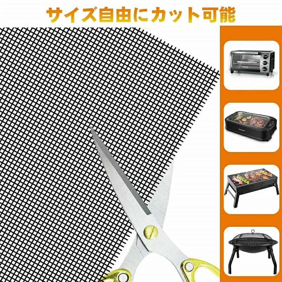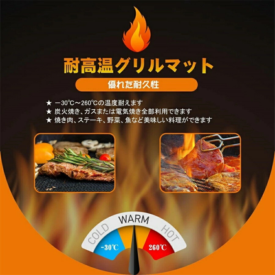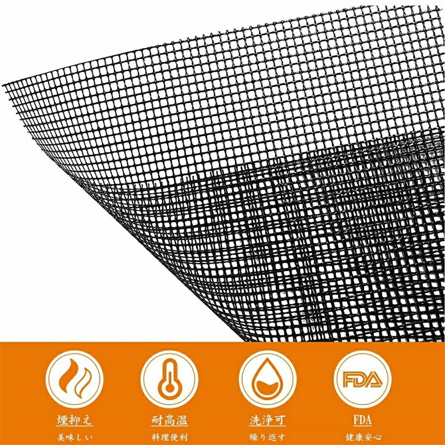 耐高温&優れた耐久性のくっつかない 網:対応温度:-30℃~260℃です。炭火焼き、ガスまたは電気焼き、焼肉、、野菜、魚、エビ、ピザ、ステーキ、ハンバーガー、パンケーキ、ベーコンと卵等を対応しております。改良版の網なので、小さな食材でも落ちないように安心的に使用できます。丈夫なグラスファイバを採用しており、繰り返して使用可能です。