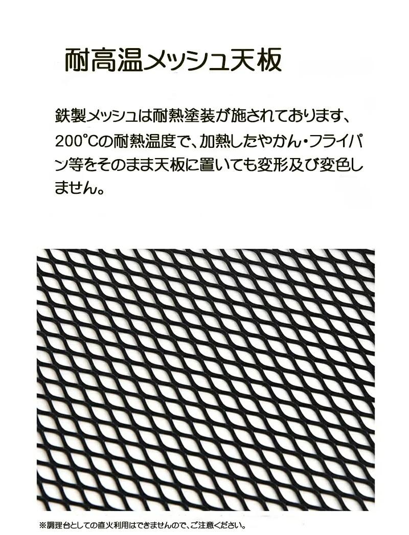 天板には鉄メッシュを使用。耐熱コーティング加工を施しているため、熱い鍋や調理器具を置いても天板の変形や劣化の現象が少ないです。