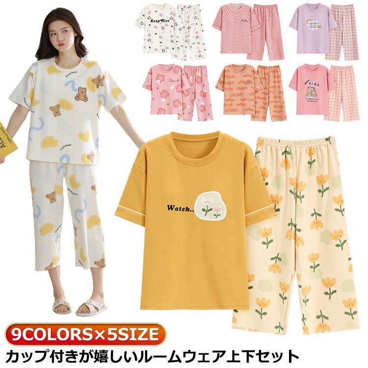 コットン 綿 カップ付き パジャマ 半袖 レディース ゆったり 女性肌着 胸パッド付 ルームウェア 女性下着 上下セット セットアップ ルームウエア 母 母の日 部屋着