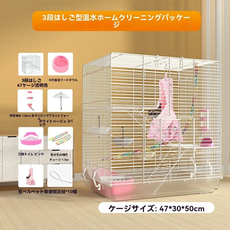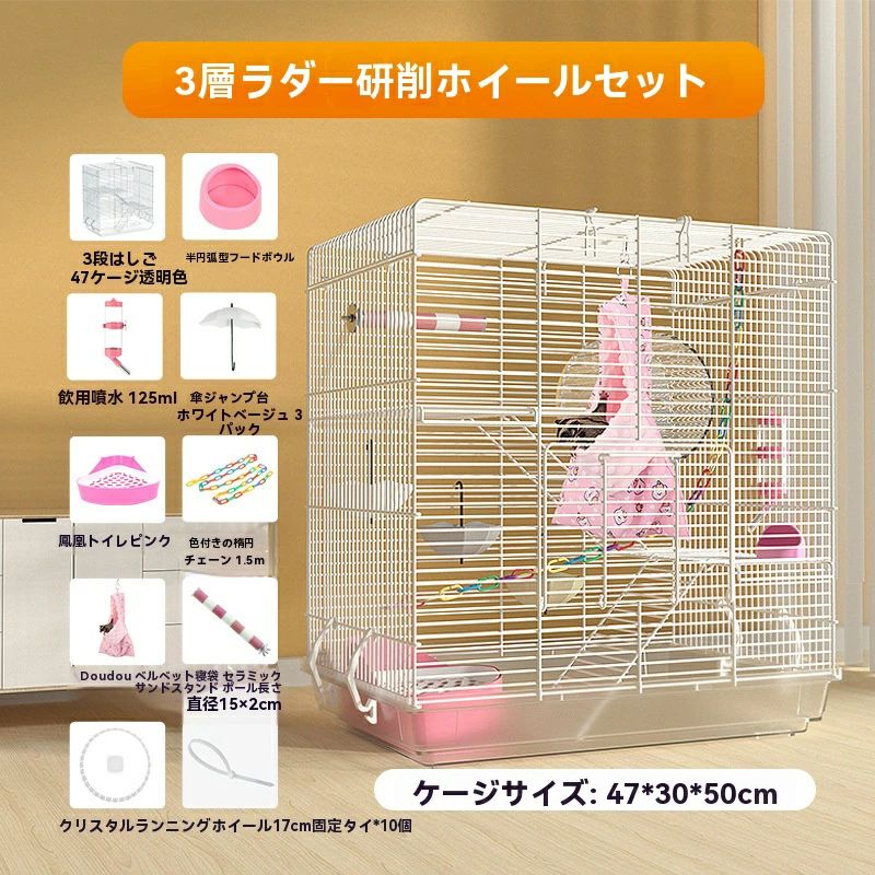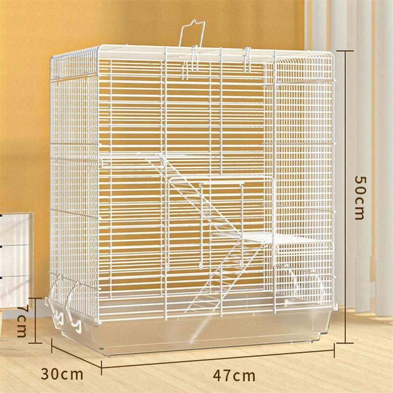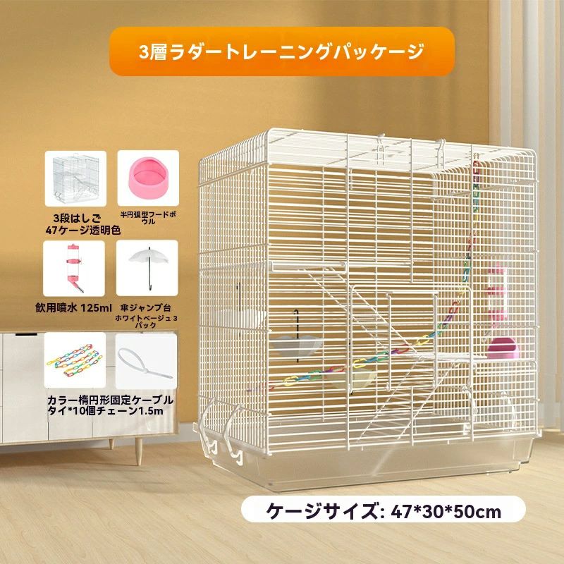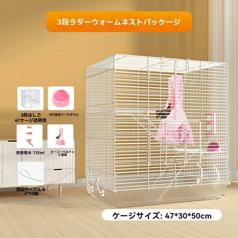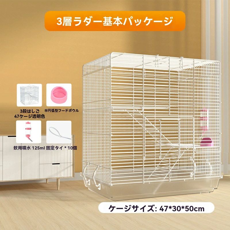 3階建てで行動範囲アップ。高さが50cmと幅が47cmある広いケージに、ワイヤーネットと階段も付いているので、上下に動き回るのが好きなフクロモモンガにおすすめ。できるだけ十分な運動スペースを確保。