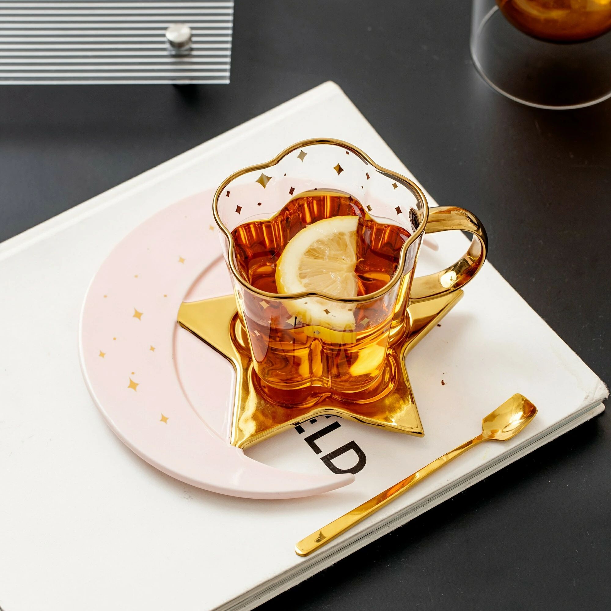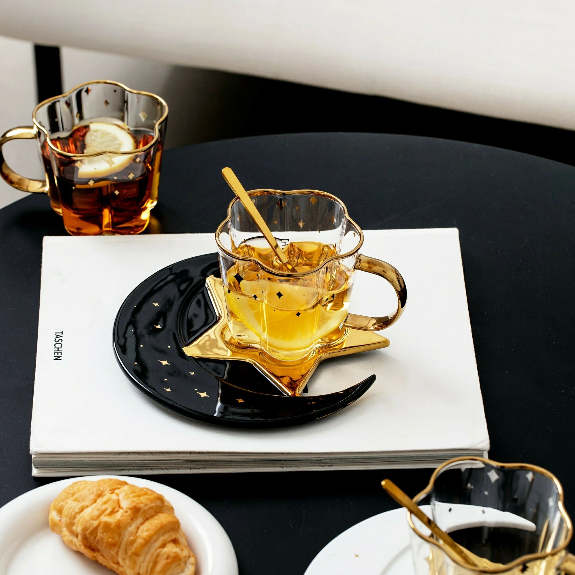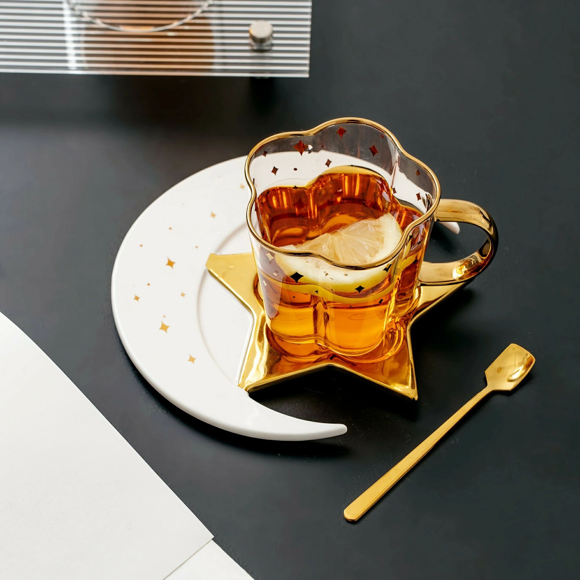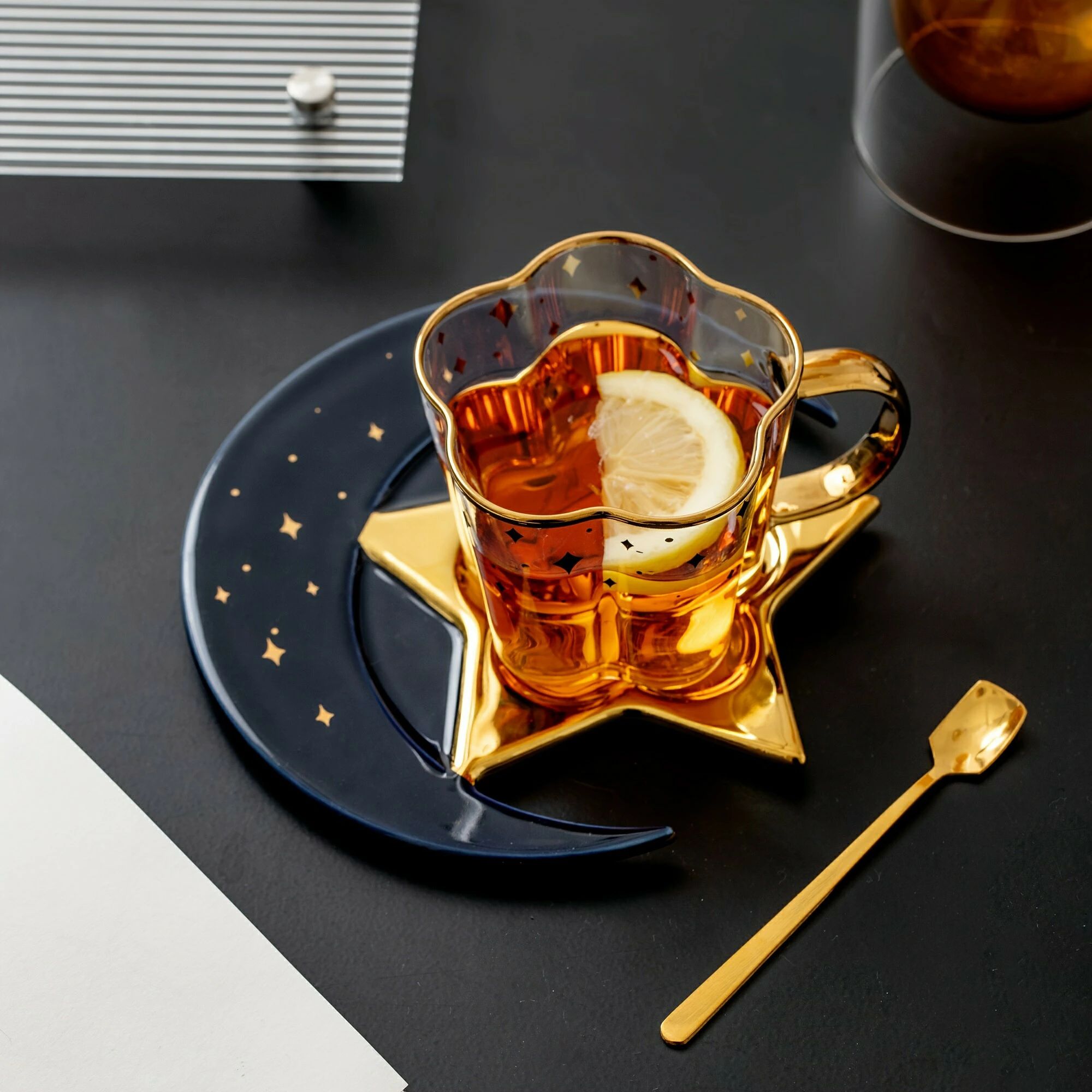 セット、星と月のデザインのティーカップとソーサー、ガラスのコーヒーカップとセラミックのソーサープレート、朝食、ティーパーティー、アフタヌーンティー、自宅、庭、レストランなどに最適なドリンクカップ、夏冬