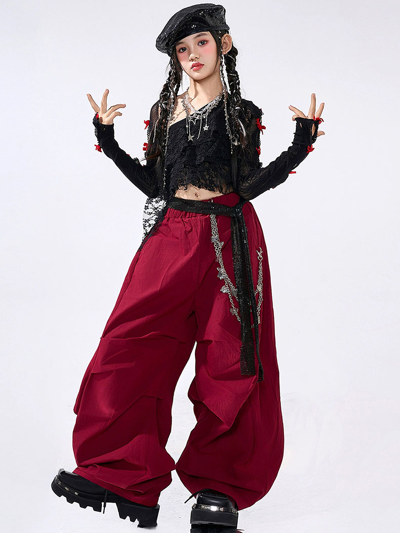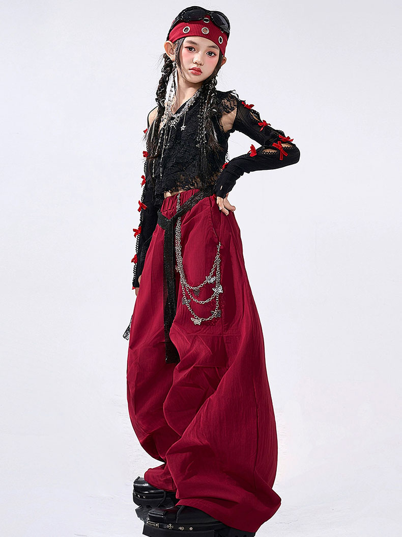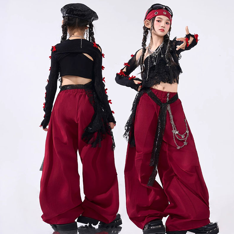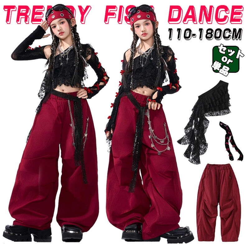 キッズ ダンス衣装 セットアップ ヒップホップ 女の子 ストリート ワンショルダー トップス カーゴパンツ レッド ブラック 子供服 y2k アイドル hiphop ダンスウェア 応援団 韓国kpop
