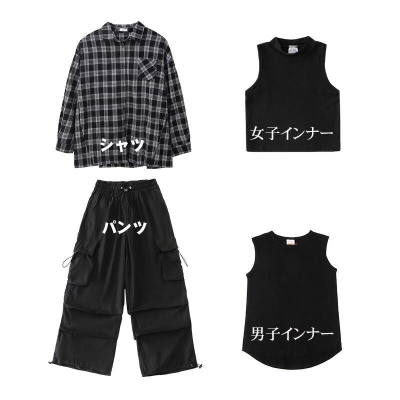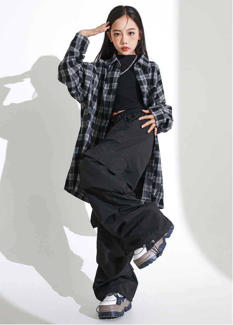 男の子 女の子 ダンス衣装 ステージ衣装 キッズ 長袖 柄シャツ チェックシャツ ロングパンツ カーゴパンツ ダボパン グレー ブラック ゆったり ダボダボ 韓国風 レッスン着 練習着 チアダ ジャズ