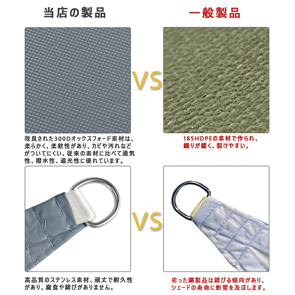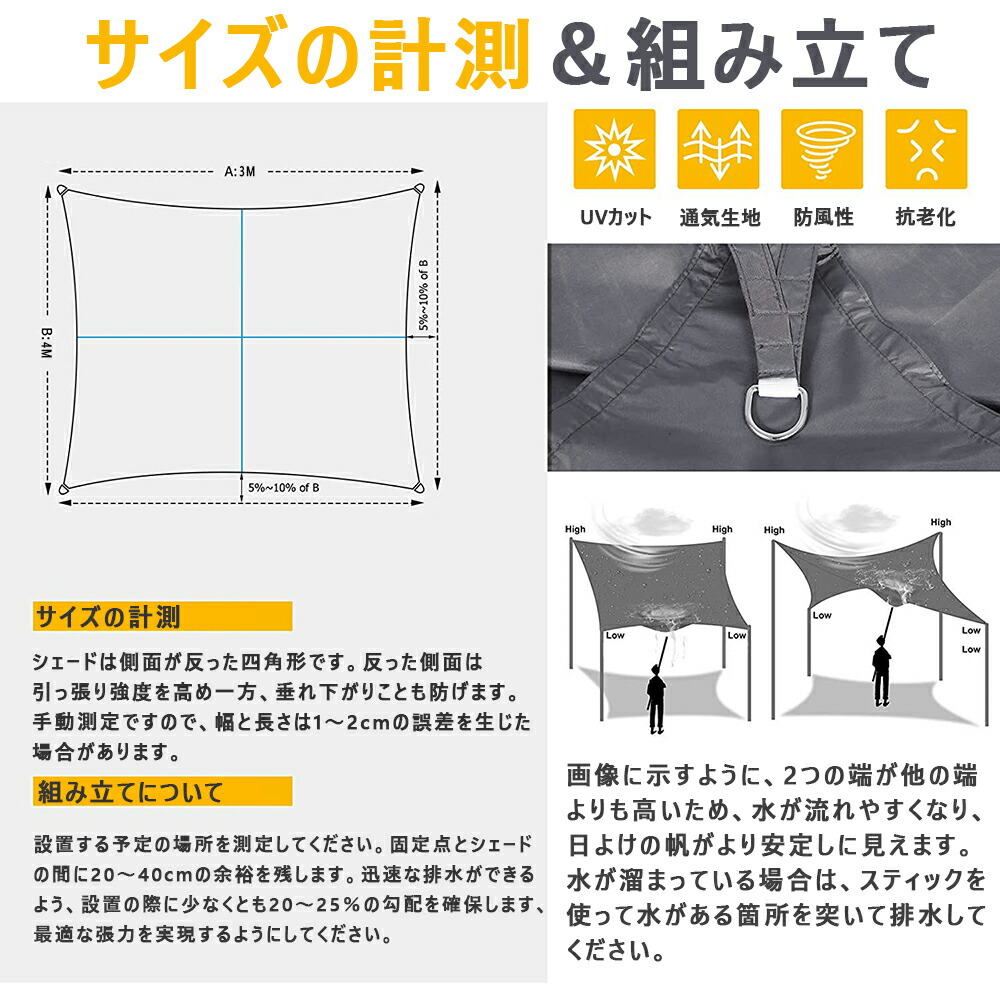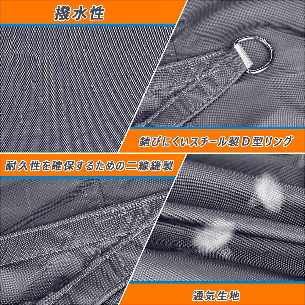 【高級素材を採用され】耐久性に優れた100%ポリエステル生地素材を採用され、強力な縫い目と各コーナーの耐久性のあるステンレス鋼Dリング、各シェードの帆には、コーナーごとにナイロンロープが付いています。