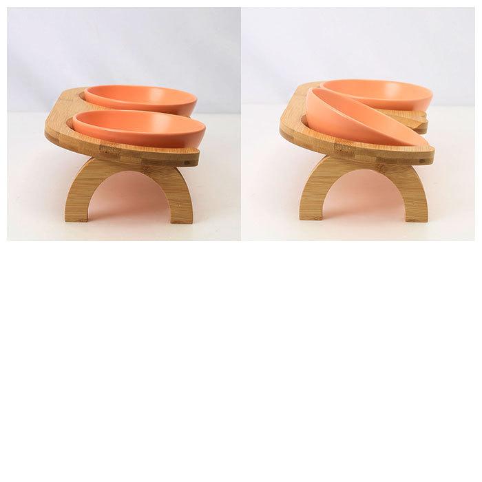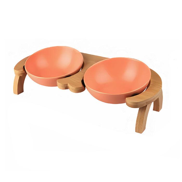 ナチュラルな木目の風合いと、柔らかな陶器の色合いがインテリアに素敵にマッチ。ネコちゃんだけでなく、室内小型犬用の食器台にもオススメ。