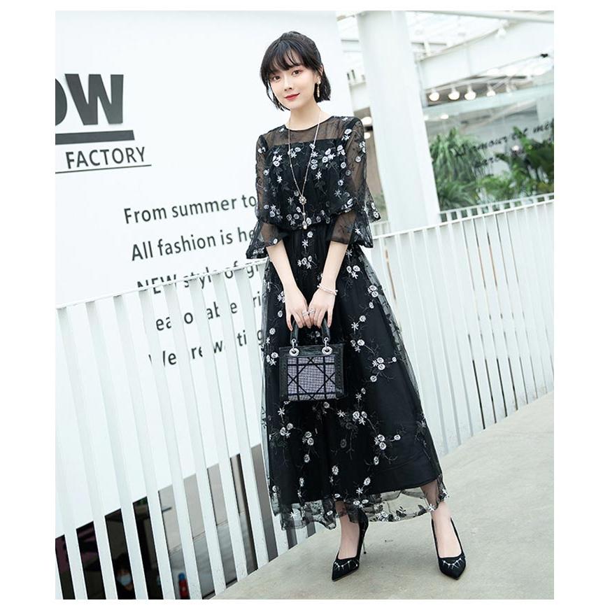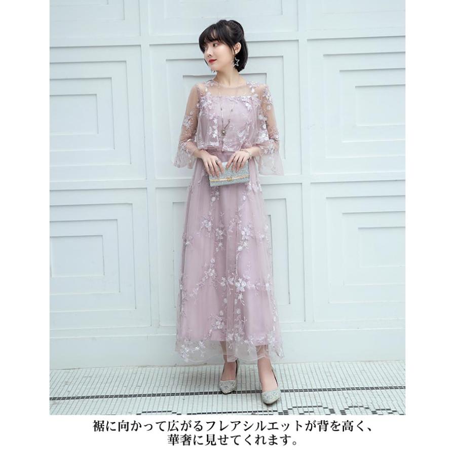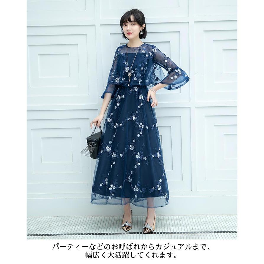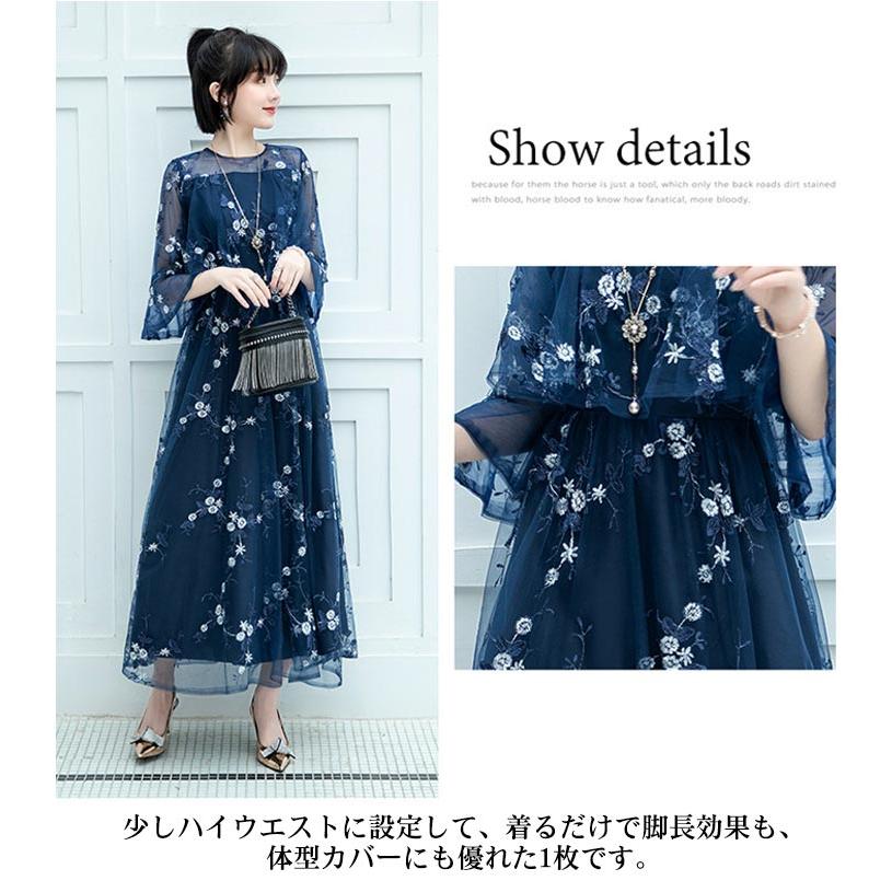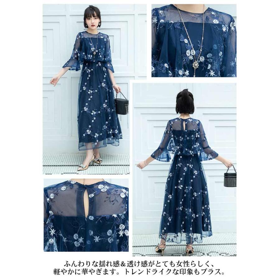 シフォン ワンピース 花柄 チュール 七分袖 フレアスリーブ 透け感 シースルー パーティドレス シフォンワンピース ワンピ ハイウェスト