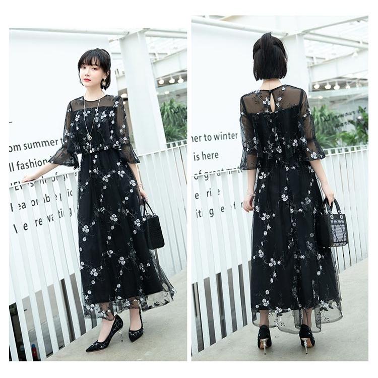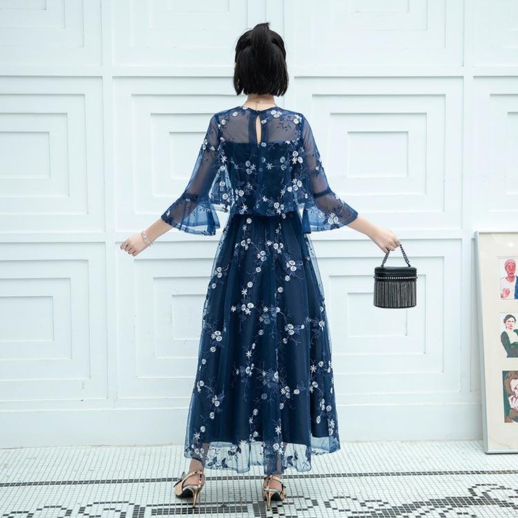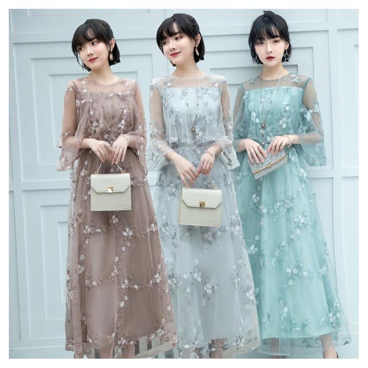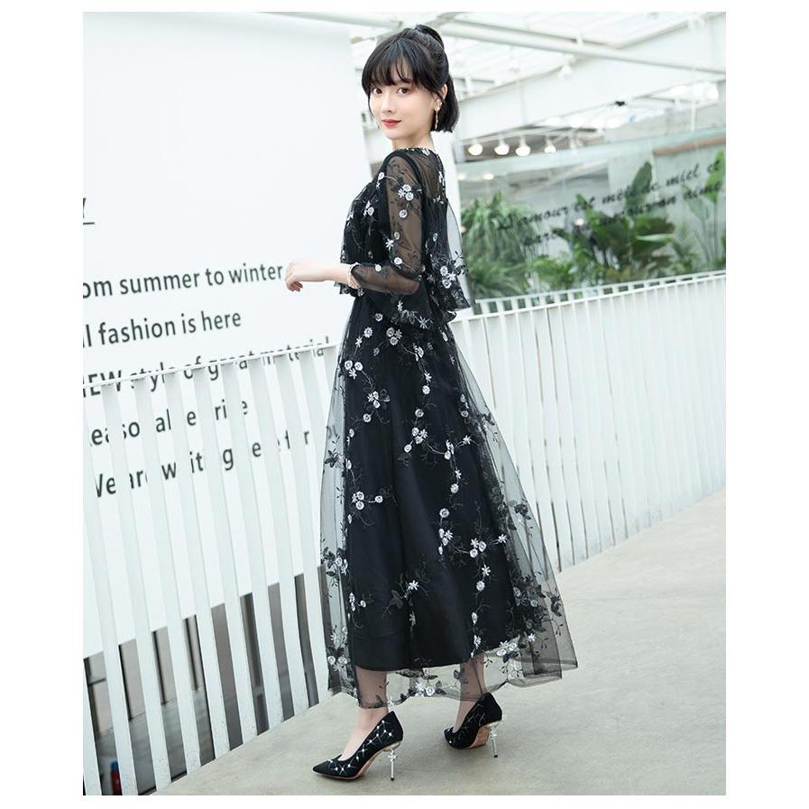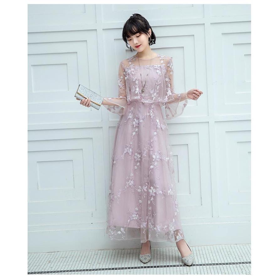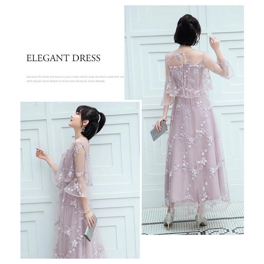 シフォン ワンピース 花柄 チュール 七分袖 フレアスリーブ 透け感 シースルー パーティドレス シフォンワンピース ワンピ ハイウェスト