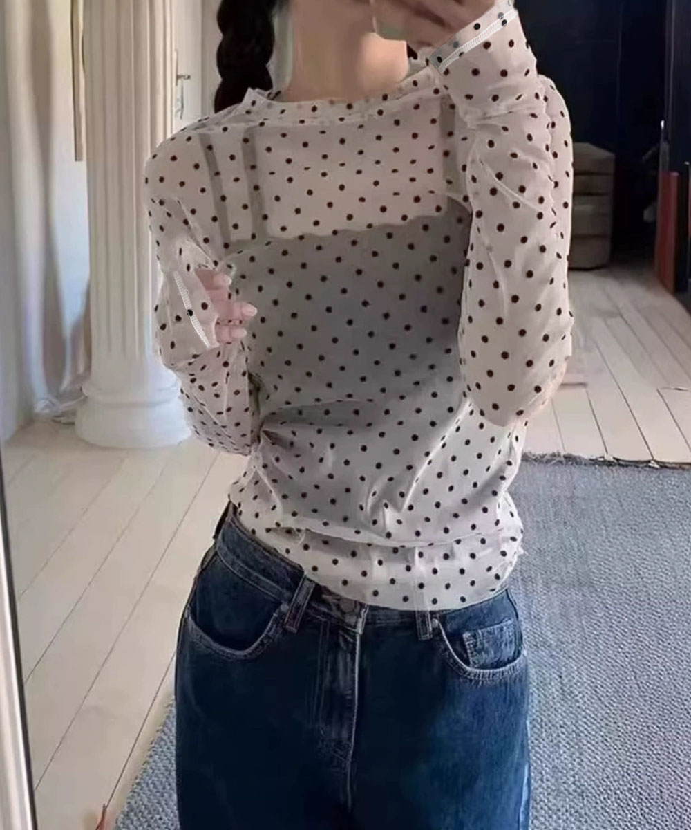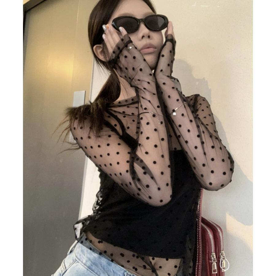 ドット柄のシアー素材が目を惹く、今季トレンドの長袖シアートップス。