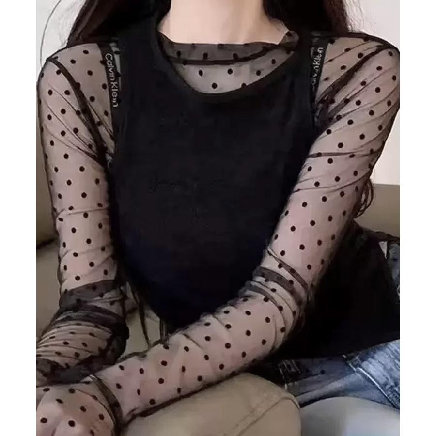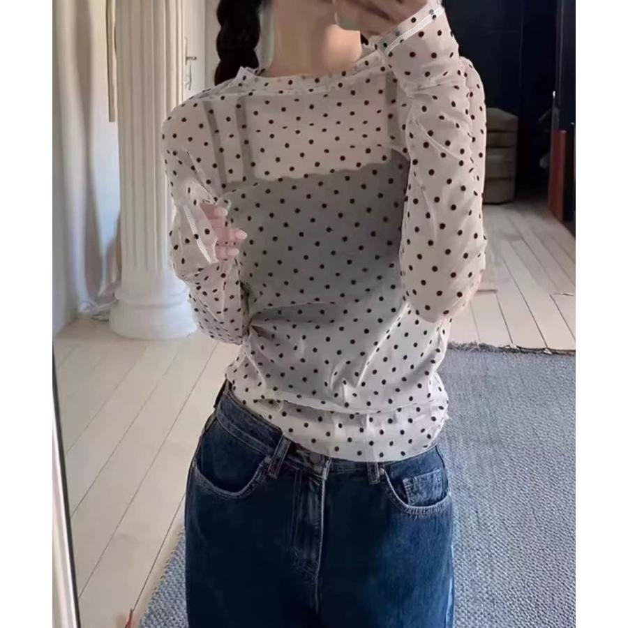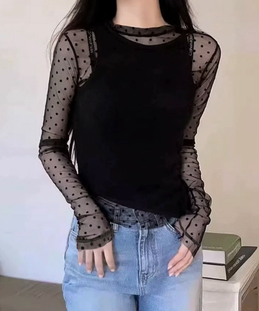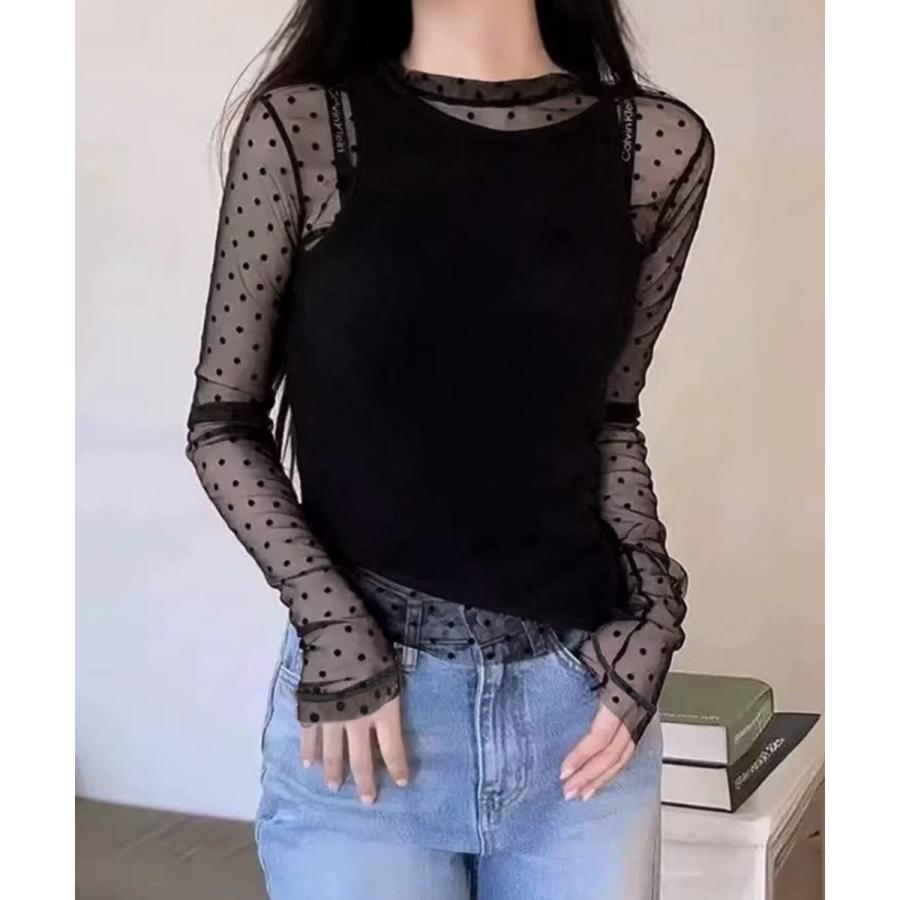 レディース ポルカドットチュールブラウス大人可愛い重ね着 薄手レイヤードインナーシアーカットソー透け感シースルートップス