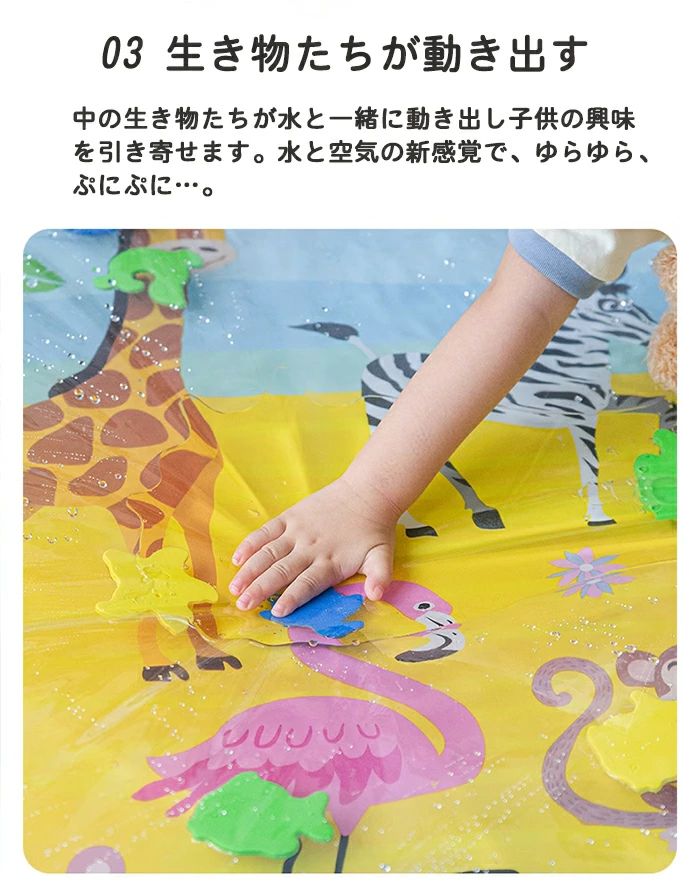 中の生き物たちが水と一緒に動き出し子供の興味を引き寄せます。水と空気の新感覚で、ゆらゆら、ぷにぷに…。