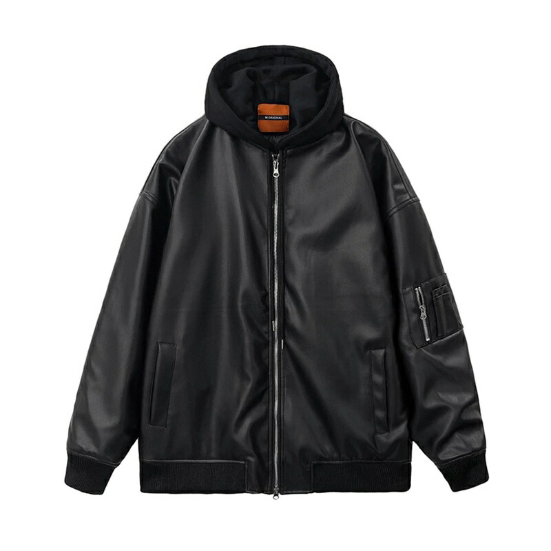 革ジャン PUレザージャケット メンズ スタジャン ゆったり フェイクレイヤード フード付き パーカー ライダースジャケット カジュアル ジャンパー 防風 アウター おしゃれ 大きいサイ ジップアップ