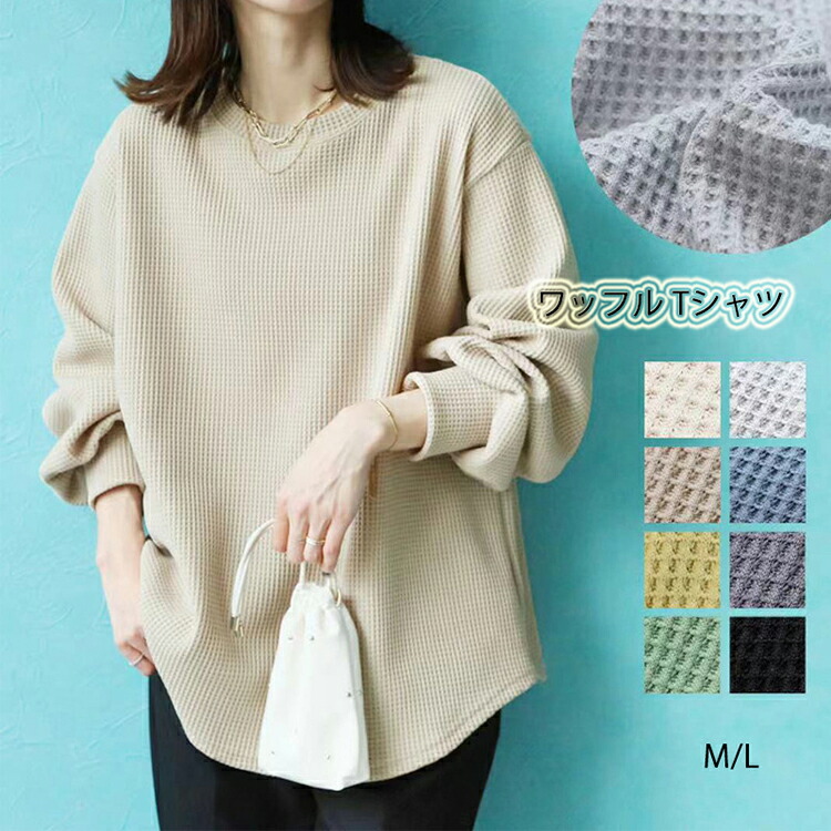 ワッフル ニット プルオーバー レディース サーマル カットソー ロンT トップス 無地 長袖 Tシャツ ロング ロングTシャツ チュニック きれいめ 丸首 お洒落 黒 秋 冬 ベージュ