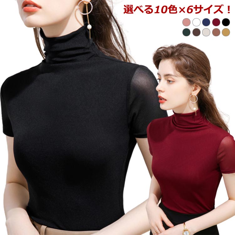半袖 秋 ハイネック トップス レディース 夏 Tシャツ 春 ストレッチ 透け袖 ハイネックtシャツ 日焼け対策 カットソー 半袖tシャツ