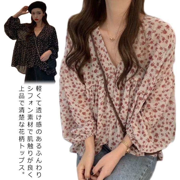 シャツ ブラウス レディース シフォンシャツ 花柄 抜き襟 Vネック 長袖 春 夏 秋 花柄ブラウス トップス チュニックブラウス プリントブラウス 大きいサイズ シースルー 落ち感 カ 薄手