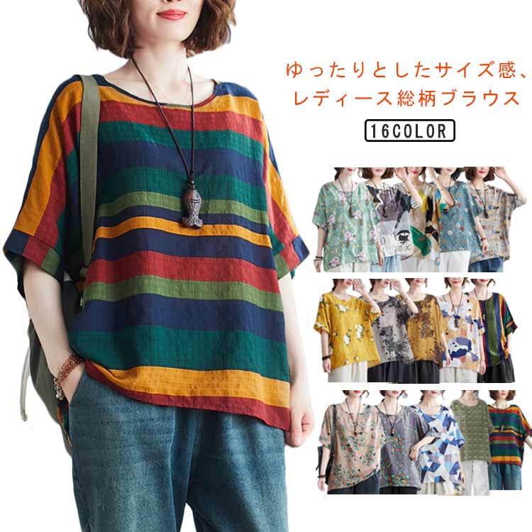 ブラウス 涼しい トップス 体型カバー 総柄 着瘦せ クルーネック 夏服 レディース 個性的 かわいい 大人 ゆったり 5分袖 薄手 フリーサイズ 女性 30代 50代 60代 リ 40代