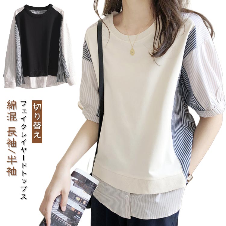 ブラウス シャツ 長袖 半袖 tシャツ 異素材 切り替え レイヤード風 重ね着 ストライプ オシャレ きれい カジュアル レディース チュニック ラウンドネック 丸首 大人 かわいい 大 クルーネック