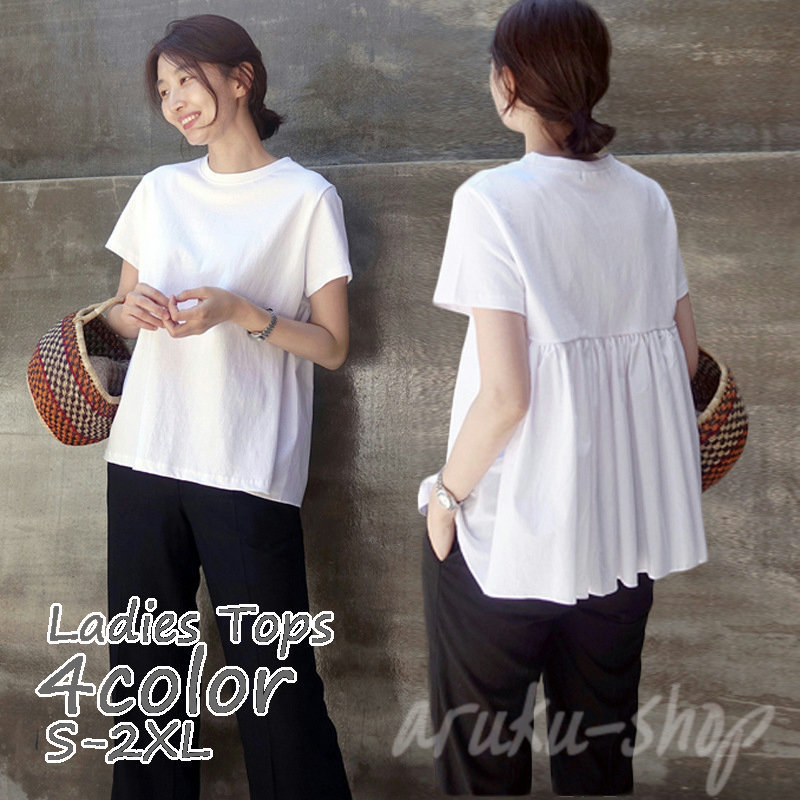 ブラウス デザインシャツ プルオーバー トップス レディース 半袖 丸首 ラウンドネック 後ギャザーバックデザイン ゆったりシルエット 無地 シンプル