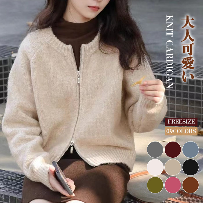 カーディガン トップス アウター ニットセーター レディース 秋冬 長袖 ジャケット ラウンドネック ニット 厚手 保温性抜群 軽い 防寒 無地 ファスナー ダブルジップ カジュアル 黒 グ ショート