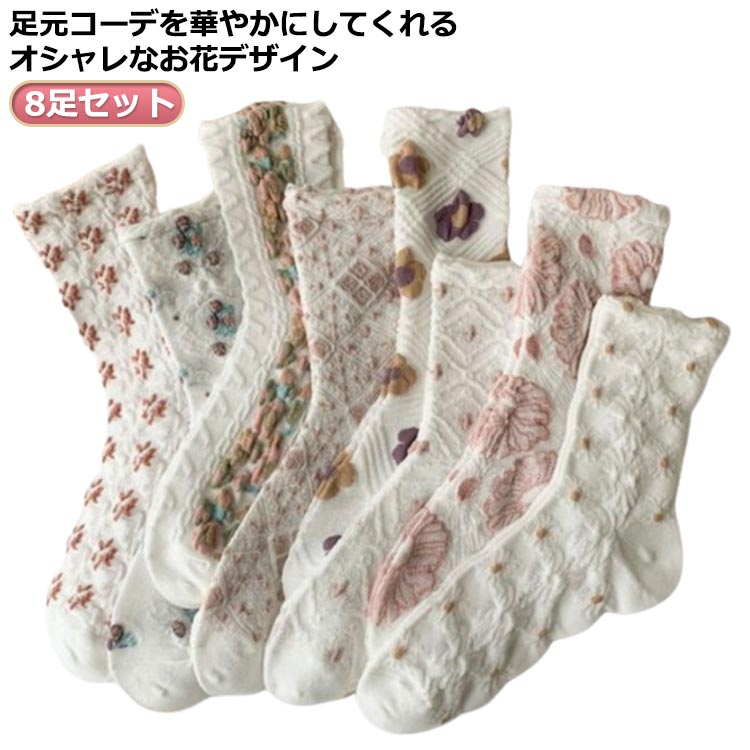 靴下 レディース 8足セット 花柄 北欧デザイン クルー丈ソックス カラフル かわいい 女性用 くつした おしゃれ 抗菌 通気性 綿 オシャレ 春夏秋冬 コットン お花 防寒 可愛い 立体的