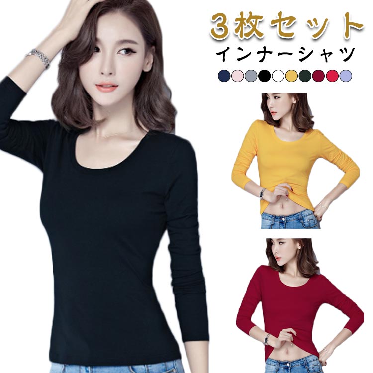 3枚組 インナーシャツ 長袖 レディース インナー シャツ 綿 コットン トップス 女性 アンダーシャツ あったか 下着 肌着 婦人 8分袖 薄手 ムレにくい シンプル 普段着 無地 定番 黒 作業着