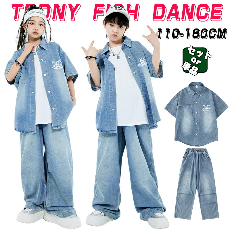 半袖 デニムスーツ キッズ ダンス衣装 単品 セットアップ 女の子 男の子 デニムシャツ デニムパンツ ロングパンツ ダボダボ ゆったり HIPHOP ロック Popp ヒップホップ