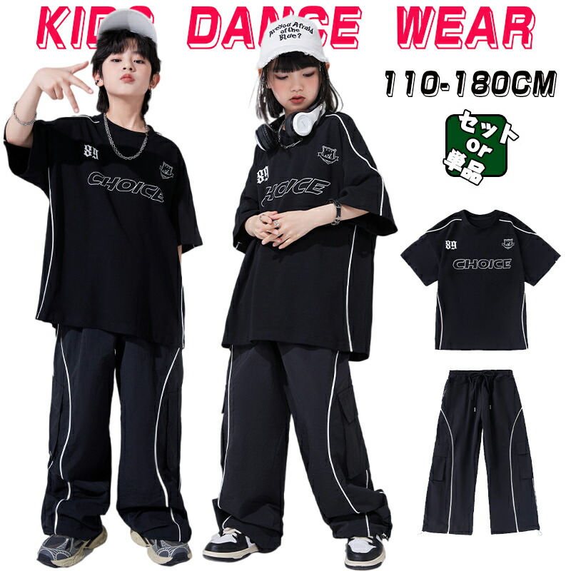 女の子 男の子 キッズ ダンス衣装 単品 セットアップ ブラック 半袖 Tシャツ ロングパンツ カーゴパンツ ワイドパンツ ログ付き かっこいい ダンスウエア ダボダボ ジャズダンス ヒップ ゆったり