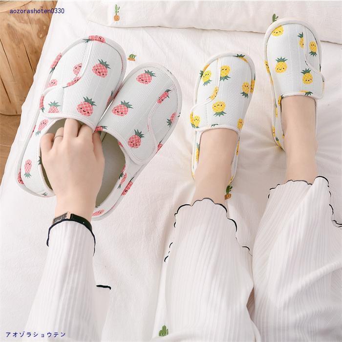 ルームシューズ レディース 花柄 果物柄 かかと付き マジックテープ 通気 入院 介護 病院 産前産後 出産準備 秋 春 室内履き パイナップル柄 スイカ柄 夏