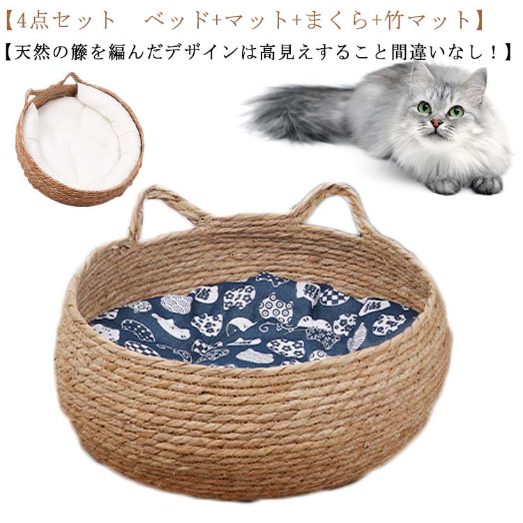 猫ベッド 猫 犬ベッド 洗える 天然素材 ペットベッド まくら 籐編み ねこ ネコ 犬 通気 涼しい 夏用 ペットマット 3点セット マット付き オールシーズン ベッド クッション付き