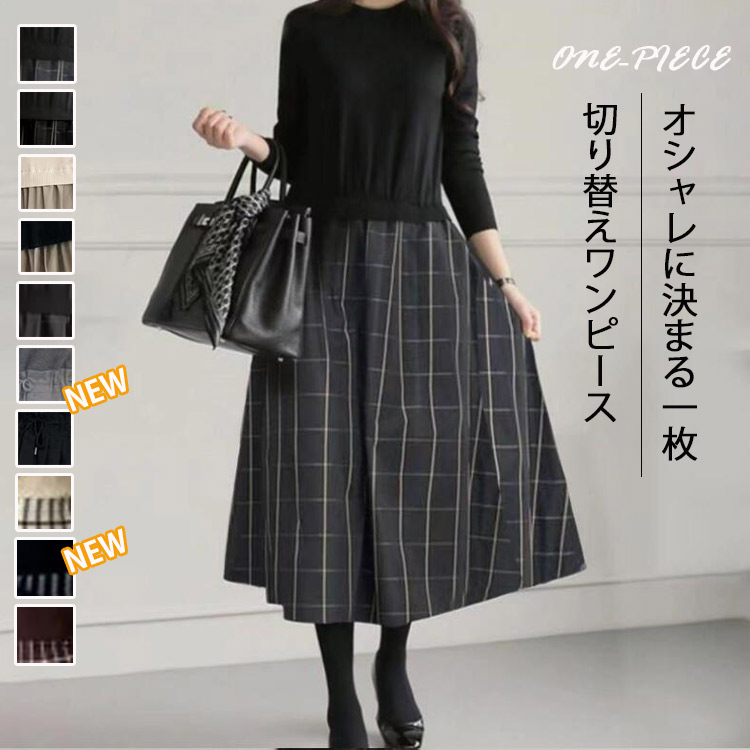 新タイプ追加! ニットワンピース 切り替え ワンピース ニット チェック 無地 プルオーバー 異素材 インナーワンピース 長袖ワンピース ロングワンピ 春 秋 20代 30代 40代 50代
