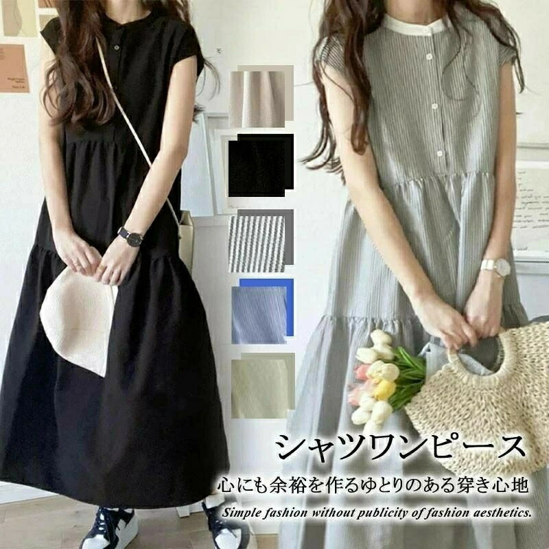 ワンピース レディース シャツワンピース きれいめ バックリボン ティアード Aライン ストライプ 無地 フレンチスリーブ ロング マキシ 体型カバー 袖なし 2024年新作 フリーサイズ ゆったり