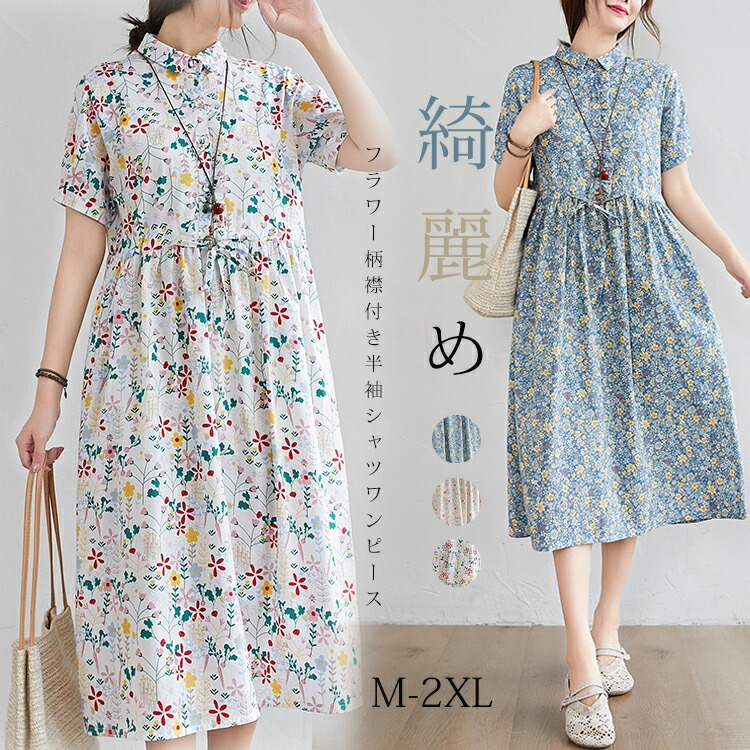 シャツワンピース 夏 半袖 前開き 花柄 総柄 体型カバー 大きいサイズ きれいめ カジュアル 大人 20代 30代 40代 50代 送料無料