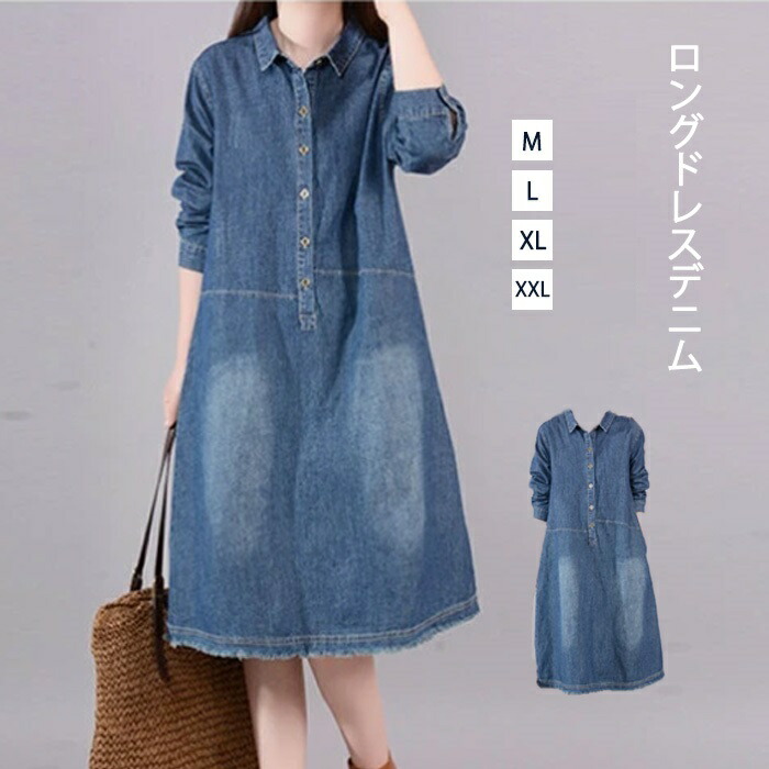 ♪ロングワンピース デニム デニムワンピース 七分/五分袖 きれいめ レディース 春 夏 秋 ロング デニムワンピ ビッグシルエット 大きいサイズ ミモレ丈 ライン ♪