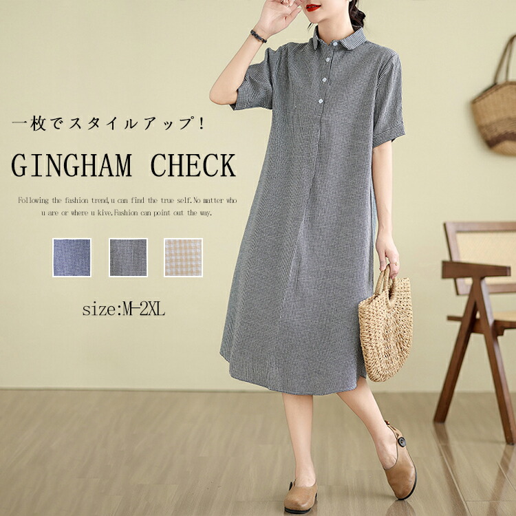 ギンガムチェック シャツワンピース 半袖 ロング チュニック シャツ 襟付き ロングワンピース レディース きれいめ ロングシャツ 大きいいサイズ ゆったり 体型カバー ワンピース 春夏 チェ 着痩せ