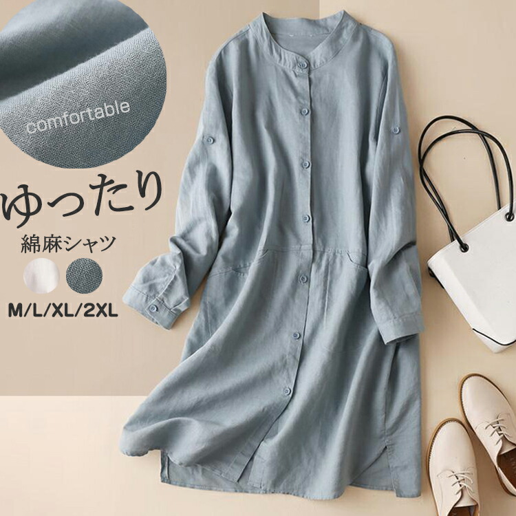 シャツワンピース 春夏 ロングワンピース レディース 長袖 スタンドカラーシャツワンピース リネン混ワンピ ノーカラー 綿麻風ワンピース ナチュラル ミモレ丈 シンプル ゆったり 大きいサイズ 無地