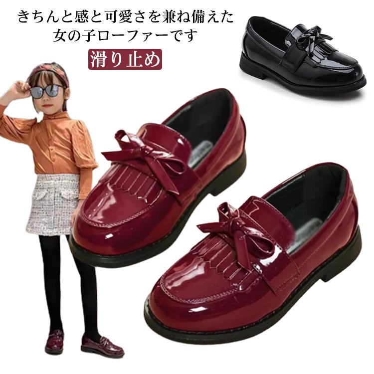 子供靴 可愛い フォーマルシューズ ローファー リボン 女の子 発表会 柔らかい タッセル付き 通学 入園式 入学式 卒園式 エナメル調 卒業式 通園 お受験 ドレスシュ 滑り止め