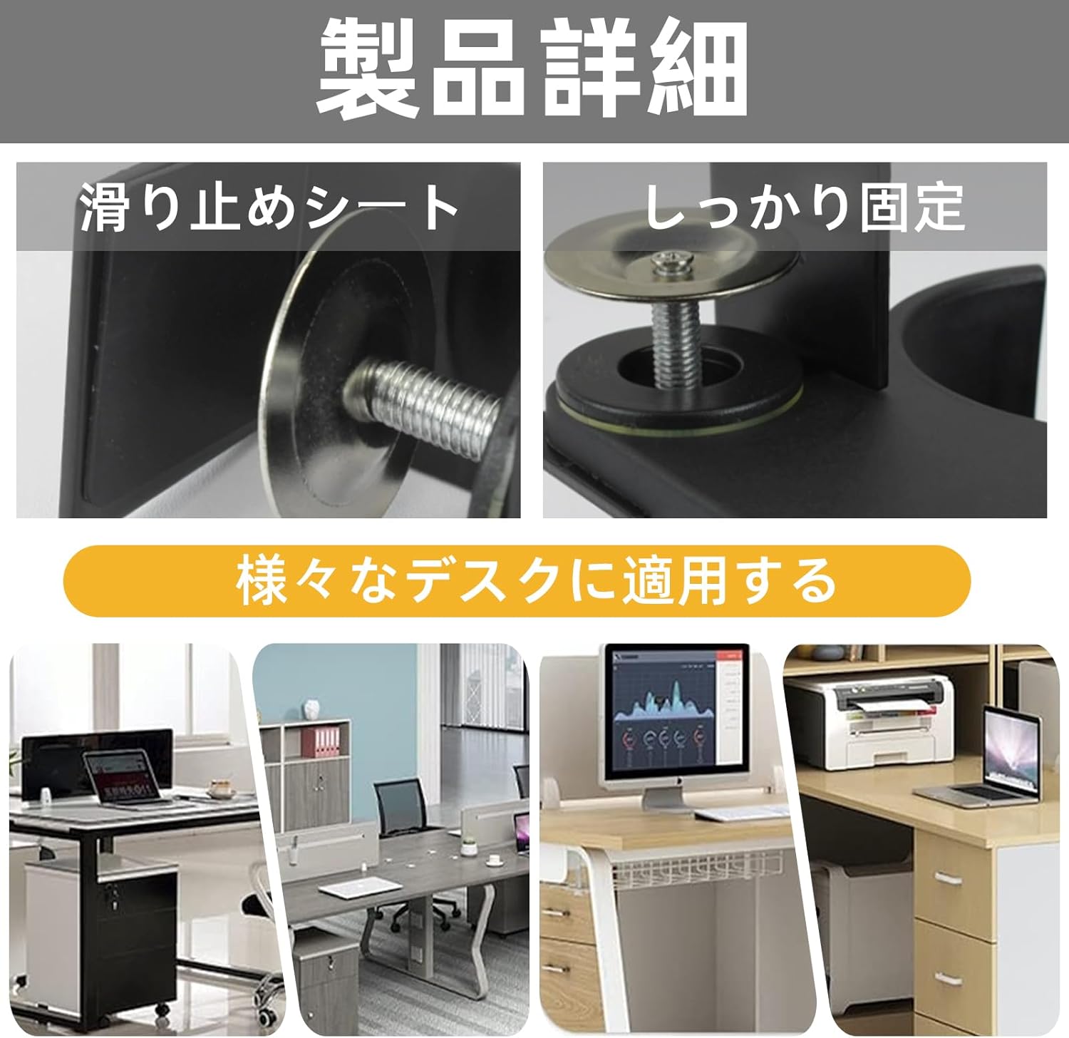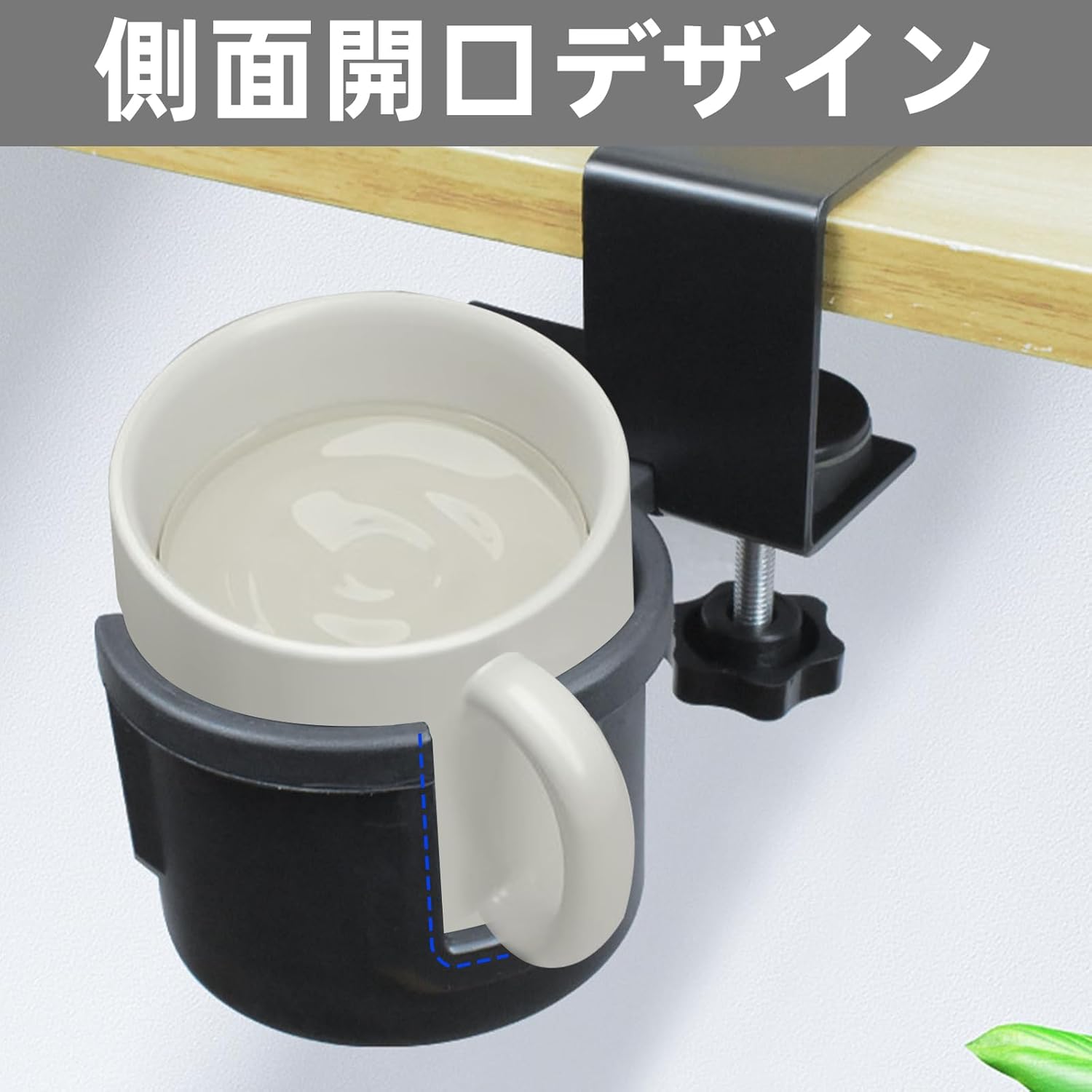 【デスクのスペースを取らない】: カップホルダーは、デスクや机にクランプでしっかり固定して、空間を有効に利用し、ドリンクやマグカップ、もしくは小物を収納出来ます。また、コーヒーや飲み物をドリンクホルダーに置くと、うっかり触れて机にこぼすことがなくなります