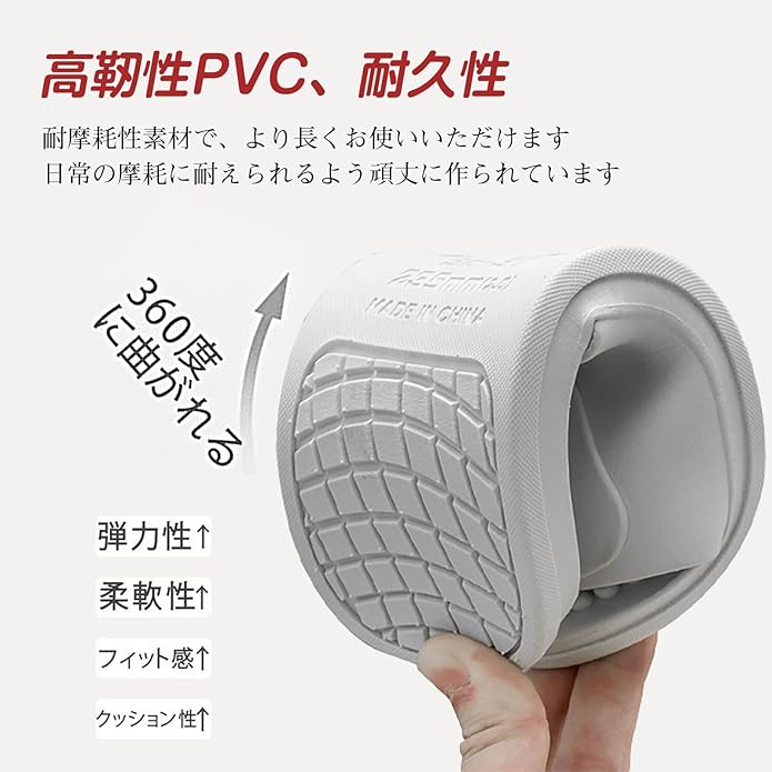 【外や水場での使用で耐久性がある】PVC素材は熱に強く耐久性が高いのが特徴です。EVA素材に比べ硬めの素材のため、ベランダやお風呂場のような場所での使用に適しています。